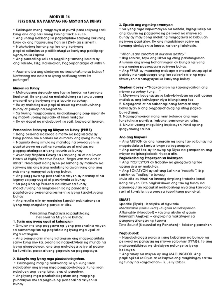 Modyul 14 Personal Na Pahayag NG Misyon Sa Buhay PDF