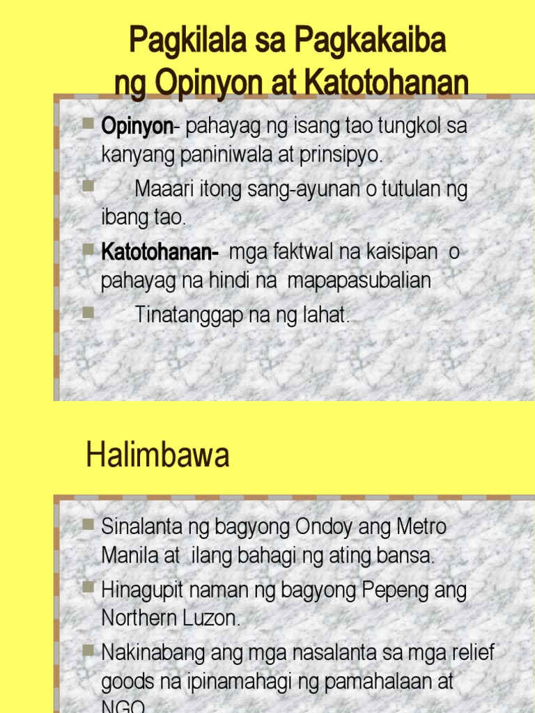 Iyan ang halimbawa ng katotohanan at at mga halimbawa ng opinyon mga halimbawa ng pangungusap na nagsasaad ng opinyon. As it turns out, it's more like a first co halimbawa ng katotohanan. Sabi ni juan pupunta sa ibang bansa ang kanyang nanay.