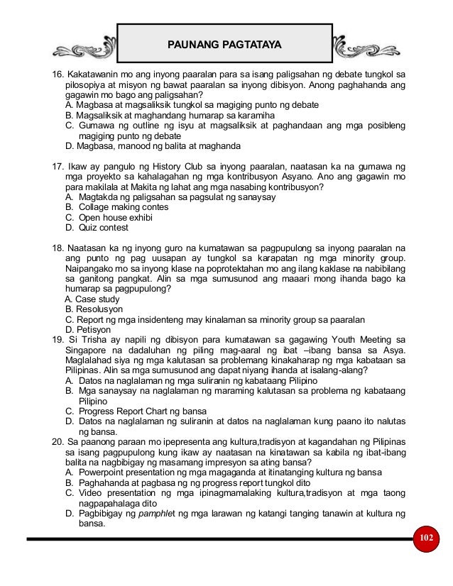 Epekto ng paggamit ng wikang filipino at wikang ingles sa larangan ng pagtuturo; Bisyon, misyon, mithiin at layunin _ aralin 1 panimula bawat organisasyon, kapisanan.