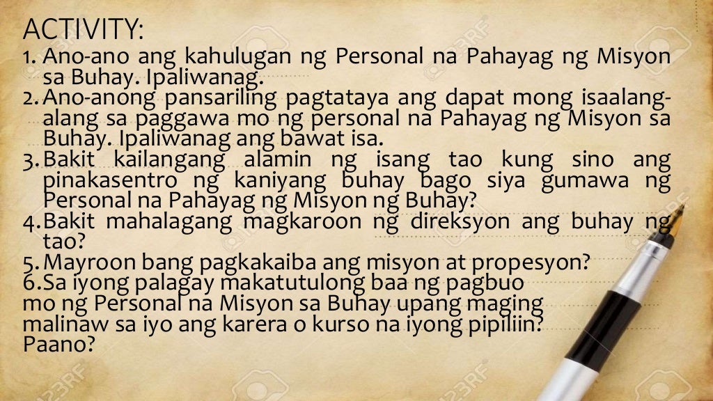 Personal na pahayag ng misyon sa buhay esp. Ito ay katulad ng isang personal na kredo o isang motto na nagsasalaysay. Ayon kay stephen covey, nagkakaroon lamang ng kapangyarihan ang misyon natin kung: Aug 13, 2019 · maipaliwanag ang kabuluhan ng wikang filipino bilang mabisang wika sa kontekstwalisadong komunikasyon sa mga komunidad;
